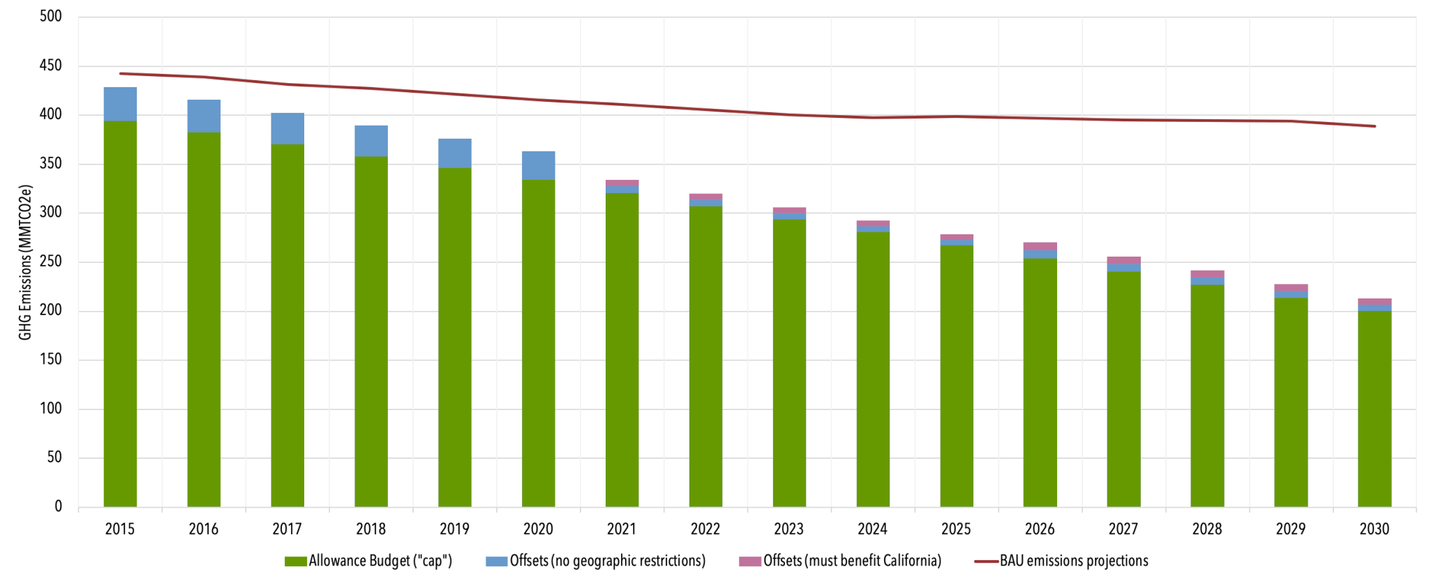 Allowed for 8% of total compliance obligation through 2020; 4% between 2021 and 2025; 6% between 2026 and 2030. Beginning in 2021 at least half the offsets used for compliance must come from projects that directly benefit California. |