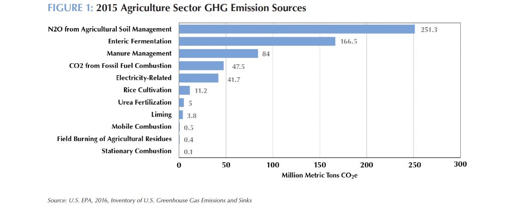 The agricultural sector was responsible for 612 million metric tons of carbon dioxide equivalent (MMtCO2e) in 2015, or 9.3 percent of total U.S. greenhouse gas emissions. Figure 1 shows the sector’s major greenhouse gas sources (excluding CO2 from soils). As of 2015, total agricultural emissions were down slightly (less than 1 percent) from 2005, but about 9 percent higher than in 1990.