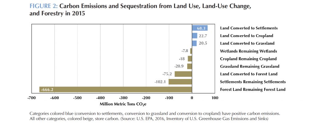The LULUCF sector sequestered a net 759 MMtCO2e in 2015, primarily in growing forests. Figure 2 shows that the primary source of LULUCF emissions is converting land to more intensive uses including settlements, cropland, and grassland.