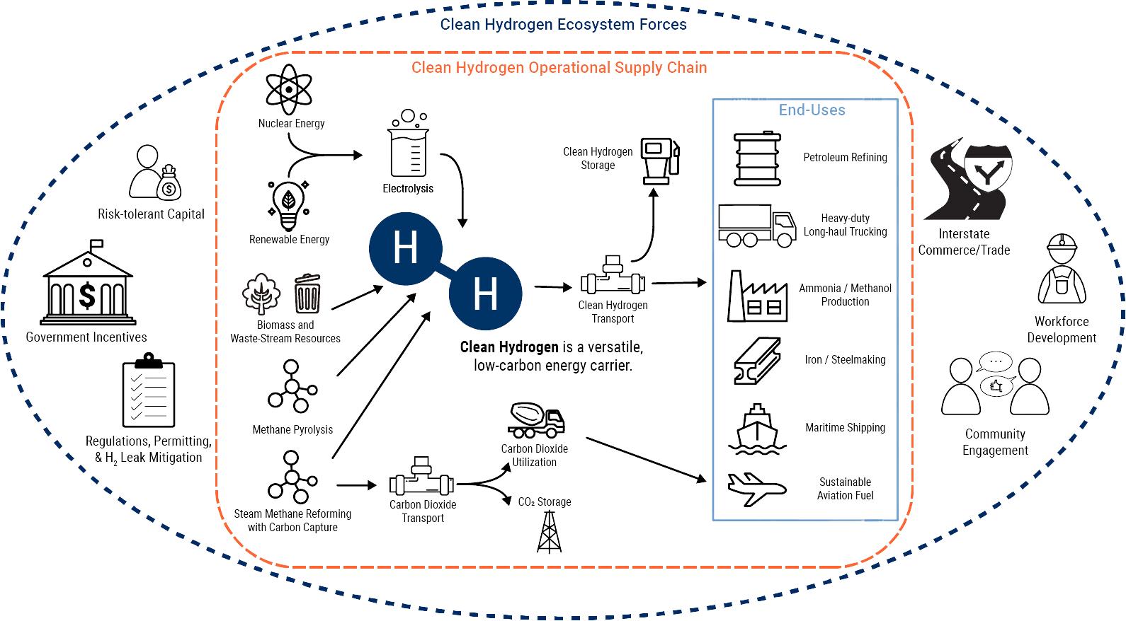 The Clean hydrogen ecosystem includes key components of the supply chain as well as important ecosystem forces. The ecosystem forces include key local, market, and government factors that will influence the long-term success of the clean hydrogen industry. Clean hydrogen” refers to hydrogen with a carbon intensity not greater than 4 kilograms of carbon dioxide per kilogram, and can be produced through multiple pathways, including steam methane reforming (SMR) with carbon capture (blue hydrogen), electrolysis (green or pink hydrogen, if powered by renewable or nuclear energy respectively), and methane pyrolysis (turquoise).